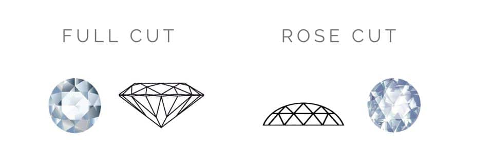 Lastly, it is important to consider shapes and cuts of stones. A full-cut stone is the more traditional option (think classic diamond shape with the point at the bottom and facets all over). Rosecut stones have made a powerful comeback in the last handful of years – featuring a faceted top and flat bottom. Sitting lower on the hand than a full-cut stone, making rosecut engagement rings better suited to a fitted or contoured wedding band as opposed to a traditional straight band.