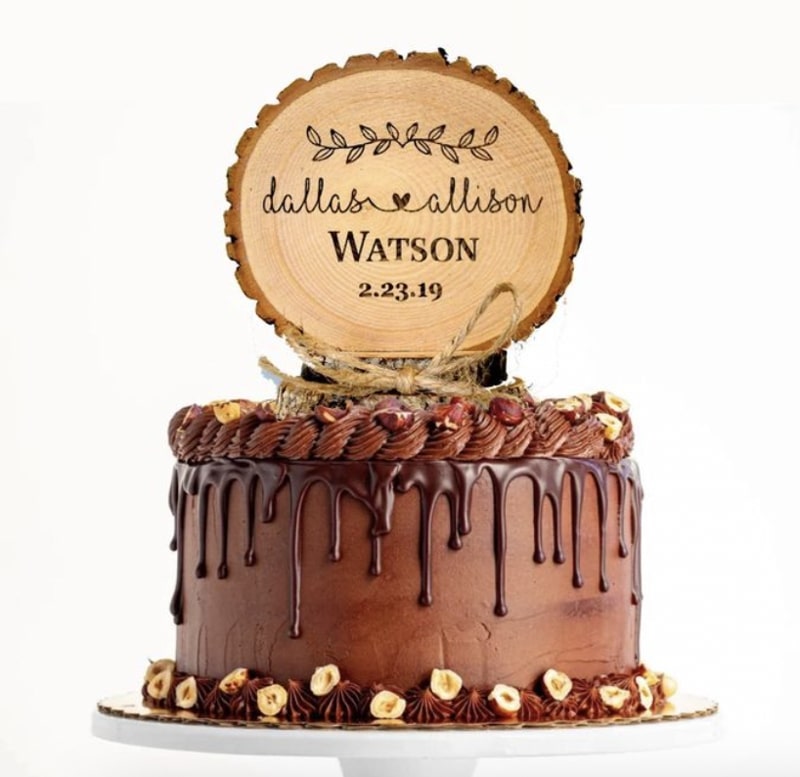 A rustic wood slice cake topper is perfect for a rustic or woodland-themed wedding. The topper features a wood slice with the bride and groom’s names and wedding dates carved into it.