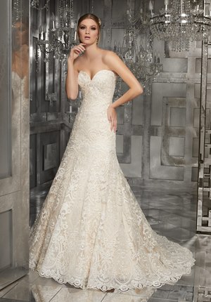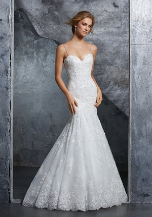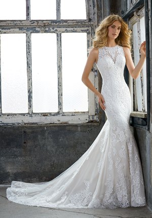 The trumpet is a wedding dress silhouette with a straight bodice that continues down the waistline and hips. The skirt begins at mid-thigh and opens out into a flared shape that resembles a trumpet. The flared skirt is easy to move around in.