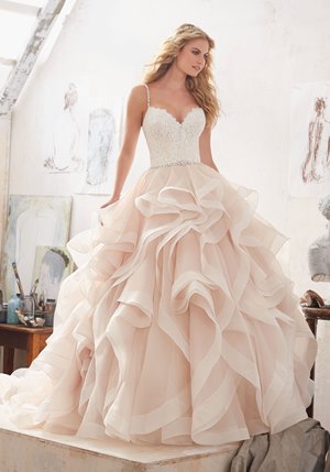 The ball gown differs from the A-line in that it usually has a wider, more voluminous skirt that is combined with a fitted bodice. The skirt begins at the natural waist and can have any length of the train. The wider silhouette emphasizes the waist while concealing the lower body.