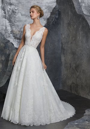 Plunging V-neckline on sleeveless lace bodice A-line gown
