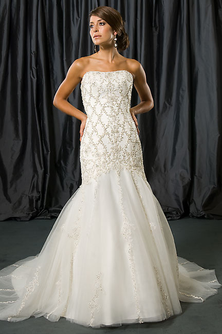 Beautiful embellishments add tons of visual impact to the gorgeous mermaid-style gown shown above. This stunning design really captures the magical appeal of this type of fairy-tale wedding dress look.