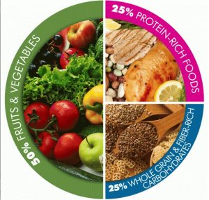 The best way to balance calories and nutrition is to aim for a healthy plate with ¼ protein + ¼ carbohydrates + ½ vegetables.