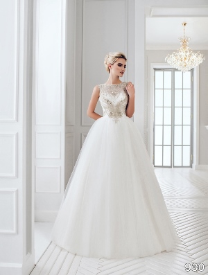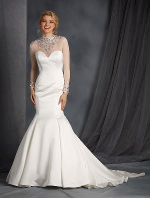 The Details: Here is a dress that proves glamour can apply to modest dress choices too. This dress has a fully covered bodice with a high scoop neckline. Swirls of luxurious embellishments fashioned out of crystal, rhinestone and silver beads spiral all over the sheer overlay yoke. These spirals subtly form a heart motif in the center, creating a significant effect that can only be noticed from afar. The bodice continues into a misty tulle skirt that is very bridal.