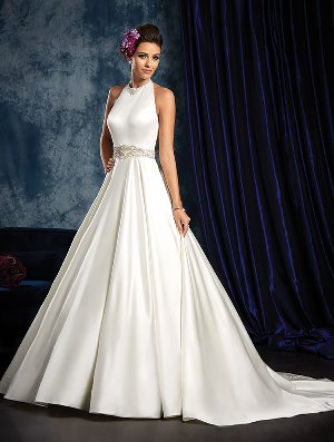 The Look: A-line satin wedding dress with a halter neckline and embellished waistband