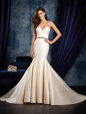 The Details: Traditional sweetheart satin gowns get a contemporary makeover in this gorgeous gown with few, but effective details. However, the mystery of this dress actually lies in the back, and not the front. The sculpted bodice leads to a skirt that flares out at the knees into a godet skirt. The sweetheart bodice is supported by embellished halter straps, even as a matching waistband decorates the natural waistline. Although all these features are impressive, the most glamorous detail about this dress is the dramatic cut-away at the back. The embellished halter neckline straps extend into a thread along the center at the back and tie to the cut-away back detail. Finally, the dress has fabric-covered buttons that continue down from the waistline to the end of the chapel-length train.