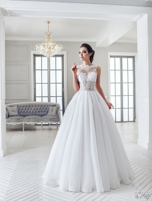 The look: Sheer lace applique yoke and grand ball gown