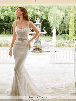 The details: No silhouette is as stunning as the sheath in defining your natural curves in a sexy way. Feminine, romantic and stylish, the Sophia Tolli is a dreamy lace wedding dress with a touch of subtle glamour. Thin illusion hand-beaded spaghetti straps support the wide scoop neckline and add definition to the bust. Intricately detailed exotic lace appliques adorn the bodice and are thin towards the edges at the waistline. The dress also features a plunging low-scoop open back which extends into crystal-embellished borders on either side. Dainty clusters of lace form a scalloped hemline that enhances the beauty of the elegant sweep train.