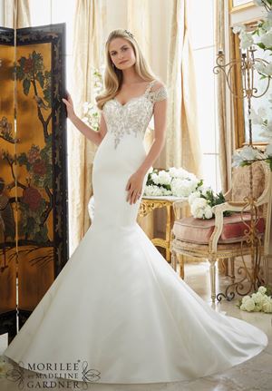 The details: The Mori Lee is a dress that packs a punch. With a fitted silhouette, the bodice flares into a beautiful ruffle skirt with waves cascading like ocean foam. The dress also features a sweetheart neckline, and the fitted bodice features a rich scattering of lace appliques down to the ruffled skirt. At the back, the dress closes in a strand of fabric-coated buttons. And this button strand courses down to the train. Finally, there is a stunning train that is as attractive as the front of the gown. Furthermore, the intricate detailing in this dress makes it one that needs few to no accessories.
