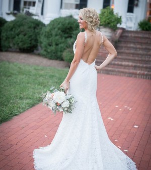 The details: You needn’t confine your glamorous look to the front of your gown. After all, if you will be wed in a house of worship, it is likely that your guests will get a good look at the back of your dress during the ceremony. So, how about spicing things up at the back a little? The Mori Lee dress does this with pizzazz! The front of the gown features a sweetheart neckline embellished with lace and with beaded straps that extend into a halter-style neckline. However, the true surprise lies in the back of the dress. The entire back has crystal-embellished floral spirals that extend from the center into a flourish of petals that spread outwards. This is a detail that is going to keep your guests enchanted throughout the ceremony.