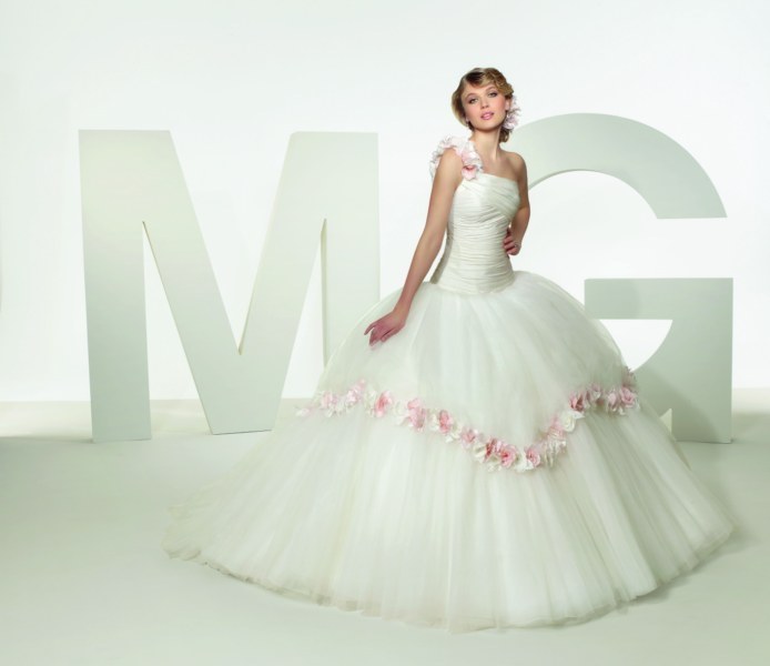 Best For Bride specializes in helping brides-to-be to make their fairytale dreams come true. To get the whole Cinderella look, choose a gown with a fitted bodice and a full, voluminous skirt. The one-shouldered bridal dress shown above is festooned with gorgeous, silken blossoms and layers and layers of filmy tulle!