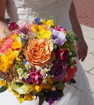 Different types of bouquets are suitable for different types of weddings, and your florist can advise you on the best options for your type of wedding and your body type. Flowers like orchids and lilies look modern and clean, and have the sophistication needed for a contemporary look. Traditional styles include round bouquets, nosegays, posies and cascades. Hand-tied bouquets are casual, romantic and rustic, while ones like the composite are luxurious and very unique. The colors in the bouquet can also be monochromatic, or mixed and matched to form combinations that work for your wedding theme.
