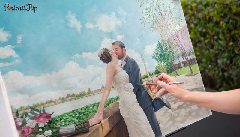 This wedding portrait will be a favourite wedding keepsake for generations to come. What better way to cherish your most crucial relationship than by giving yourself a treasured, one-of-a-kind gift that will forever mark your wedding? Having a live artist at your wedding is the best way to entertain your guests. This outdoor wedding idea will be the perfect conversation starter in your living room, and your guests will love the artistic element added to your home.