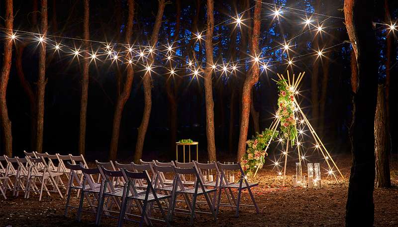 When setting the perfect mood for your wedding day, lighting up your wedding venue is just as important as adding flowers, good food, and atmosphere. While you can brighten your celebration with everything from charming candles to classic Edison bulbs, decorating with string lights is one of the most common wedding trends in vogue. Couples adorn this look for its eccentric, fairy-tale vibes—and trust me, you will love it too!