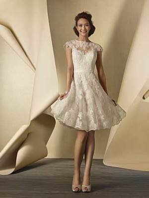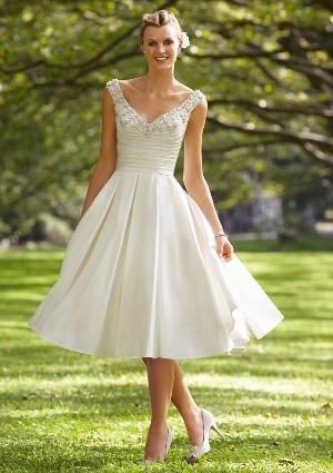 The Mori Lee wedding dress has a shorter hemline and a full skirt that easily camouflages the full hips of a pear-shaped bride, while the closed neckline makes the bust area more prominent.