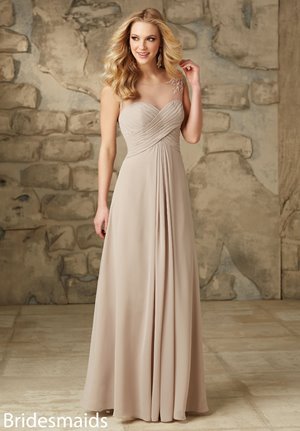 This A-line, beige evening dress from the Dessy Evening dress collection is a safe bet in fit, colour and style.