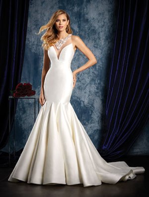 This gown features a plunging sweetheart neckline, but in a safe manner that will support the bride’s bust. It has a barely-there sheer yoke fashioned in a halter style, so the bodice is supported and held up in position without effort. The illusion neckline is adorned with crystal beading that resembles a necklace. This eliminates the need for an additional neckpiece. Plunging necklines are usually paired with spaghetti straps, but this illusion-style pairing defeats that any day. The entire dress has a single satin finish, with a full godet skirt. The absence of other embellishments besides the necklace adds to its sophistication and style. The back is equally captivating, with the illusion neckline continuing into a band of encrusted crystal details that culminates in a low-cut V shape.