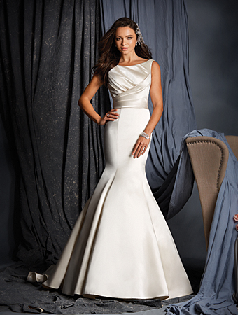 The beautiful bateau neckline continues into a dramatic drape across the bodice and ends at the waist. The different textures of the bodice and the skirt have been created so beautifully that a slender waist is highlighted perfectly in this fit and flare gown. No poufy layers, no beading, and no lace anywhere on this dress, yet it is stylish and fashionable. The subtle design makes it perfect for a traditional church wedding, and the silky finish renders it luxurious.