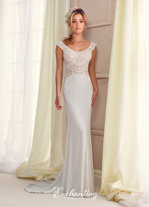 Another dress from the Mon Cheri Bridal collection, this dress features silky soft satin in a sheath silhouette that creates the illusion of curves. The dress clings to the body, emphasizing the beauty of the natural figure. A textured bodice with sheer lace appliques further enhances the overall effect. Although the dress is modest and doesn’t reveal too much skin, the bodice and skirt come together to create an arresting effect from top to toe.