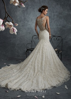 Look at this magnificent beauty from the Sophia Tolli dress collection. A scattering of intricately designed lovely lace appliques emerge along the back of the dress, with sparkling crystal and embroidery details for added bling. The dress looks beautiful from the front as well, with its slender slaps and trumpet silhouette. Nevertheless, it is the details in the stylish back that will be memorable.