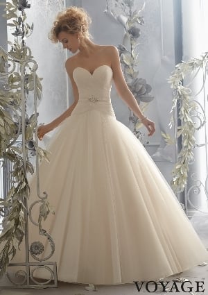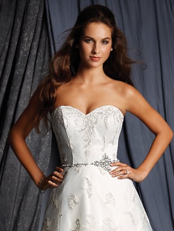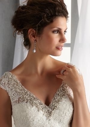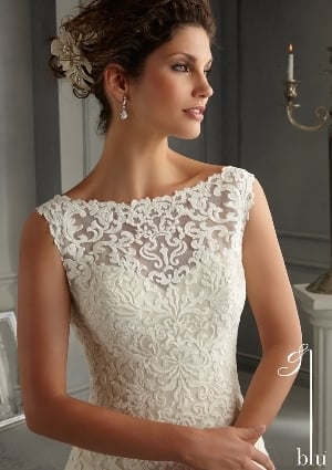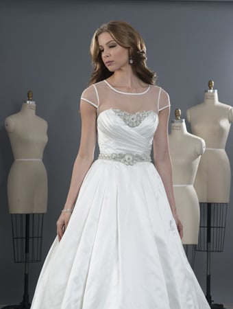 Illusion: One of the most popular styles today, the illusion features a thin layer of sheer fabric over the actual bodice. This may be embellished with beads, rhinestones or lace to create beautiful details. It offers a covering to the bust area and usually ends higher up in a round, halter or bateau style neckline.