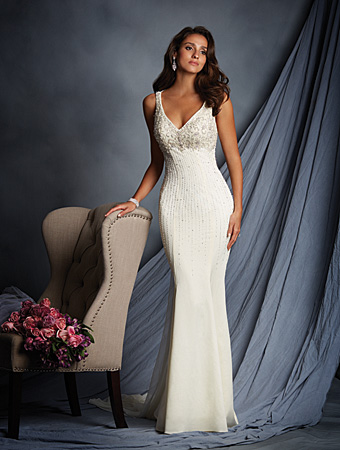 Sheath: A straight-cut dress that falls over the body frame naturally and loosely drapes the actual curves of the bride. Suitable for slim figures and hourglass brides.