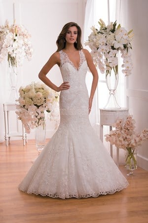 Trumpet: The trumpet is similar to the mermaid and is another fit and flare style, with a fitted bodice and body. But here, the dress flairs at mid-thigh instead of at the knee. Thus, it hides the hips and legs and is good for hourglass and rectangle-shaped brides as it emphasizes the curves.