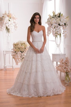 Ball gown: This dress usually features a fitted bodice and a full skirt that is usually poufy with several layers of fabric. This is the silhouette commonly associated with fairy tales and princesses and is great for rectangular and pear-shaped brides.