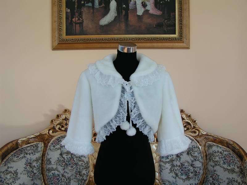 If you would like to look at something warmer and a little more dressy, we also have this beautiful fur cape with fine Tulle lace lining the sleeves and Peter Pan collars and further covering the edges along the entire length. The neckline can be drawn close with the little woolen tassels and keep you smug for as long as you have to spend in the outdoors. It is a great choice to wear with both lace wedding gowns and satin gowns, as the style works well with both vintage and modern styles alike.