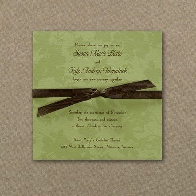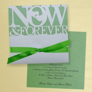 Begin your wedding planning by choosing a refreshing green invitation card for your big day. Featured here is a Now and Forever wedding invitation from the Best for Bride wedding invitation collection. The pretty combination of silver with green shimmer, makes it an elegant and attractive card. The bright green bow adds a pop of color to the muted background in the remainder of the card, and inside is a monochromatic green card with black lettering. It is a simple, but stylish choice that will offer your guests a hint of the color that will be in focus on your wedding day.