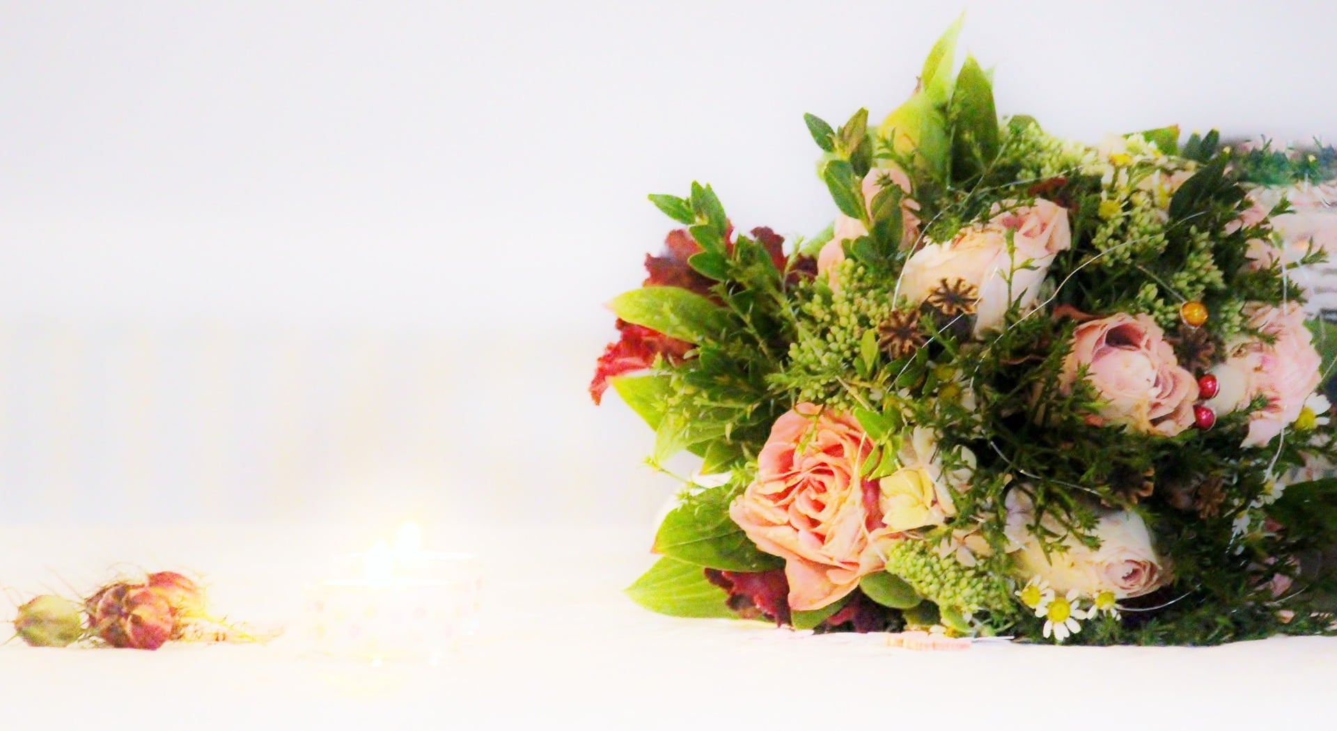 While an entirely green bouquet can be fashioned out of leaves and green colors like the cymbidium orchid and chrysanthemum, we prefer the highlighting of green with the right amount of mixing with a lighter color. In this beautiful bouquet, the richness of green is enhanced by the presence of peach and soft pink, with a scattering of white daisies. The green colors in the bouquet are all in a single shade, and this accentuates the effect of the color. The few red berries in the design make it further attractive, as red is a color that compliments green beautifully.