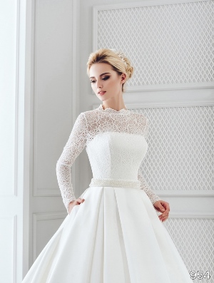 Chantilly lace creates a mesmerizing effect for this A-line wedding gown from the Sans Pareil collection. Lace details adorn the yoke and full sleeves. Elaborate swirls spread over the entire misty collar. They extend into illusion sleeves for a slimming effect. This is in direct contrast with the silky satin skirt and textured waistband. Additionally, the slight collar has a scalloped edge with intricate detailing, ensuring that every part of the dress is a work of art.