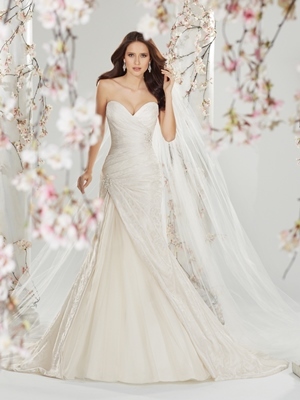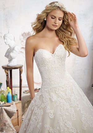 A wedding dress looks beautiful when the bodice has lace embellishments. This effect contrasts beautifully against a smooth skirt. Alternately, the lace bodice also works well with layered or satin skirts. This mix of textures in the bodice and skirt creates a unique effect. Here is a gown from the Mori Lee collection that achieves the desired effect. The dress has a simple A-line silhouette, but the lace motifs in the bodice contrast beautifully with the soft pleats in the skirt.