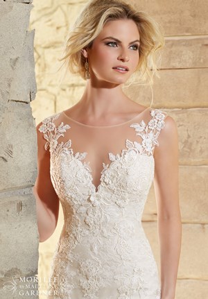 Alencon lace sweeps over the hemline of this wispy Mori Lee Wedding dress. The light, airy fabric forms a beautiful base for the white lace appliques. A scalloped hemline completes the length of this gown in full style. The delicate floral clusters also extend to the rear and into the train, creating a romantic feel.