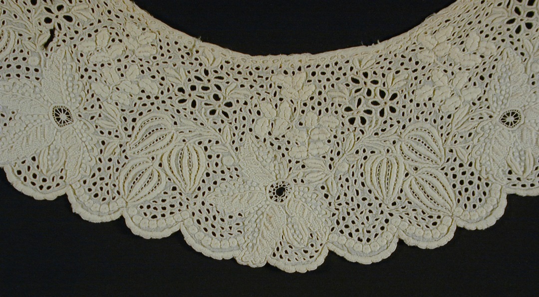 Alencon lace has floral motifs on a net background. Typical designs include Victorian floral details like cabbage roses, daisies, scrolls and medallions. It will usually have an eyelet or bearded edge. For more information on identifying Alencon lace, visit this article on Lady Violette.