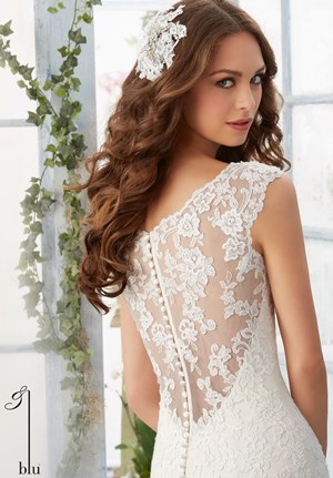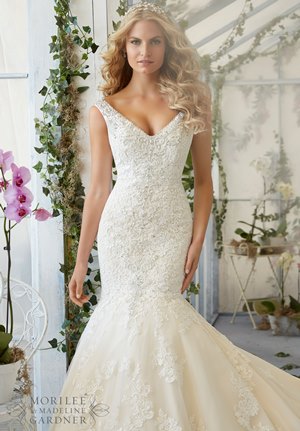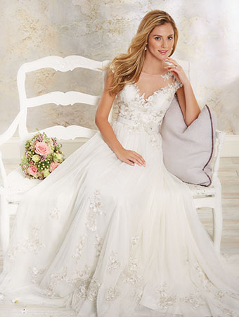 This elegant A-line dress is a universally flattering choice, and is modest but very feminine. The tumbling white floral lace appliques extend from the illusion scoop neckline to the waist and slightly beyond. Another dress that is similar but has a more formal touch is the full-length 2948 tulle gown with a sweetheart neckline. You can check this dress out at this link.