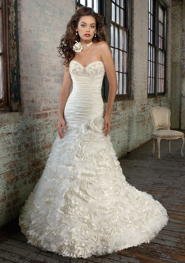 Be a bride with a difference when you add a touch of black to your wedding day outfit. This dress from the Jasmine designer bridal collection has a trumpet silhouette. From the strapless neckline, the dress follows the natural curves all the way up to the thighs. From here, it opens out into a layered misty skirt. The entire bodice has a ruched criss-cross effect for textural finesse. However, the signature element has to be the black lace appliques that adorn the length of the bodice along the sides. It extends from the bust all the way to the dropped waist, and has a pronounced effect. Classic and sophisticated, yet unusual, this is a dress for the bride who wants to stand out from the rest.