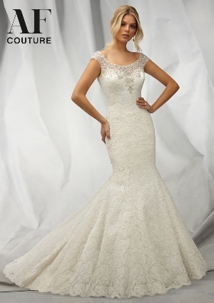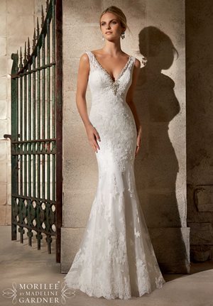 This dress from the Mori Lee designer collection is the epitome of glamour, with timeless and classic details. The sateen finish of the slip beneath the lace overlay renders a luxurious touch to this dress, even as captivating floral lace appliques course all over the bodice and skirt. Although the dress doesn’t have sleeves, the high illusion bateau neckline gives it the modest touch it deserves. Princess seams run along the fit and flare silhouette and are another classic element that defines the structured silhouette, making it even more endearing. The rich and tasteful elegance of the lace motifs placed artistically over the entire dress and the 3-D effect crafted out of the lace over the satin slip adds to its charm. At the back is a rounded scoop neckline that can easily be covered under a veil.