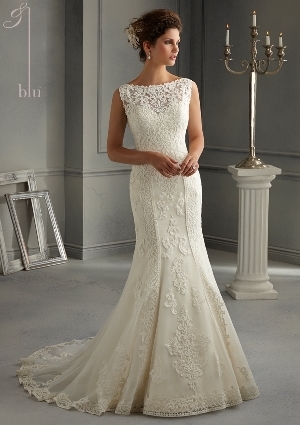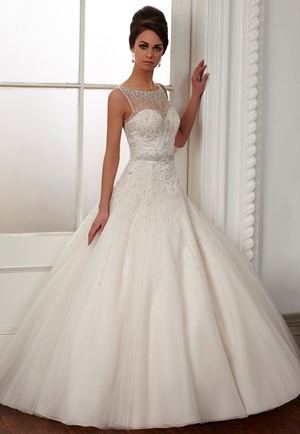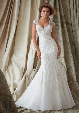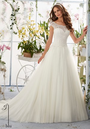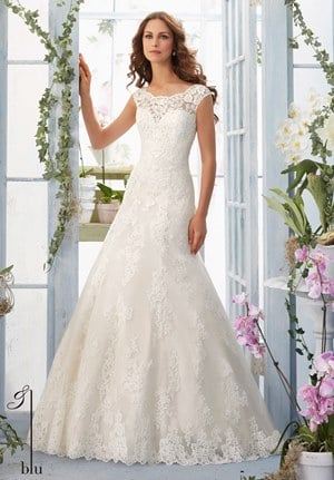 A beautiful lace gown with cap sleeves and an illusion scalloped bateau neckline, the Mori Lee 5410 is a dress that is both modest and endearing. The modified A-line silhouette is a modern choice that makes it suitable for most body types. Although the silhouette isn’t too snug like a fit-and-flare dress, it still allows the bride to flaunt her beautiful curves without feeling uncomfortable. The ample lace appliques in the bodice add a luxurious touch to the entire gown, spilling into random clusters in the skirt all the way down to floor length. Behind the illusion style neckline is a sweetheart bodice. The back of the dress features amazing illusion details created with lace appliques. Although it a dress that covers the entire body from neck to toe, it is still stylish and sexy. The vintage feel associated with this gown makes it a perfect choice for a rustic wedding fashioned after a vintage era.