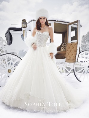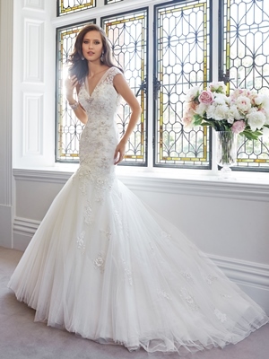 This fishtail gown from the Sophia Tolli collection has a unique style for the neckline and sleeves. Delicate and wispy tulle forms a net-like layer over the lace cap sleeves and fashions a V-neckline. This then grows into a sophisticated V-neckline. The entire bodice is embellished with elaborate floral lace appliques decorated with crystal beading and sparkling details. As the clusters grow sparse in the skirt, layers of delicate tulle fan out to form a cascading train of chapel length. The V-neckline in the front extends similarly to the back, revealing no more than a bit of skin along the center.