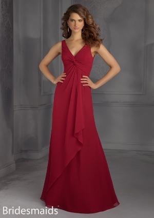 Now, look at this sophisticated red bridesmaid dress sporting a modest V-neckline. The chiffon beauty in the Mori Lee Bridesmaids Fall collection has the two sections crisscrossing at the center and forming a V-neckline that balances out an empire waist. The ruffles that flow down the center add an element of drama and make this gown a perfectly unique piece.
