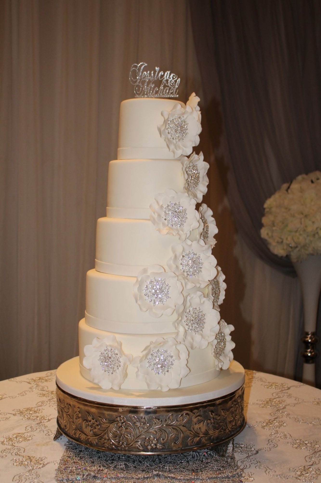 This beautiful wedding cake was created with large broaches finished as centres for sugar hand crafted flowers, matte finish and bling made a beautiful contrast.