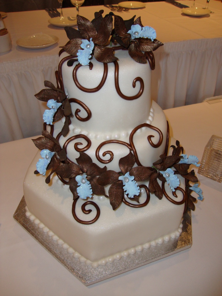 This wedding cake named "Constance" was created for a winter wedding with white, chocolate brown, periwinkle blue and silver colour theme.