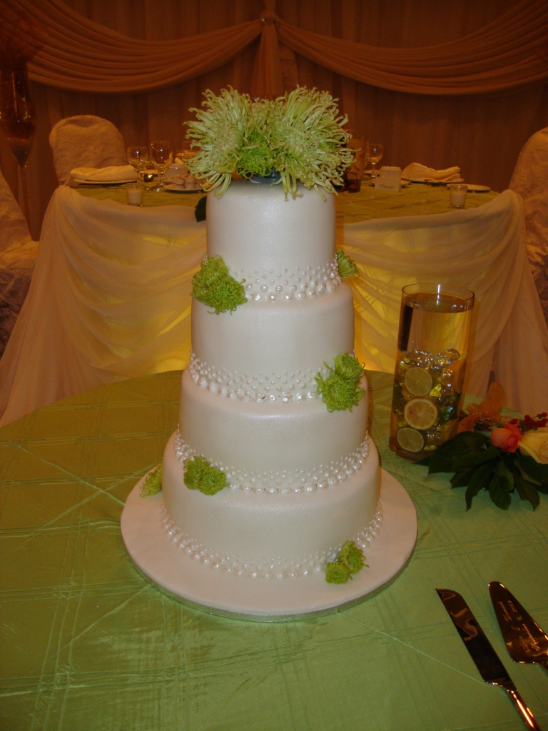 "Green Mums" wedding cake was done in 4 tiers and decorated with fresh mums provided by a couple to match their beautiful and warm green and yellow wedding colour theme.