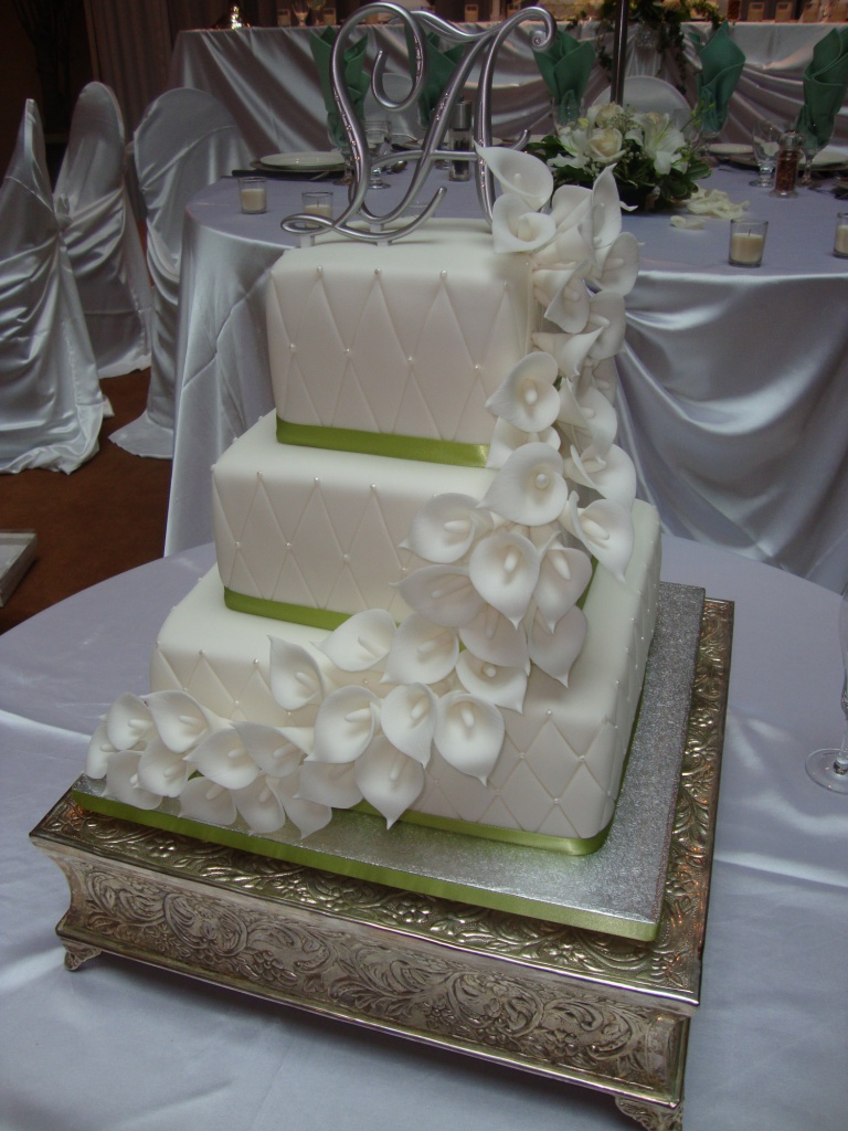Oh! So beautiful and elegant wedding cake "Leila" was created in white fondant with sage green satin ribbon and fondant calla lilies.
