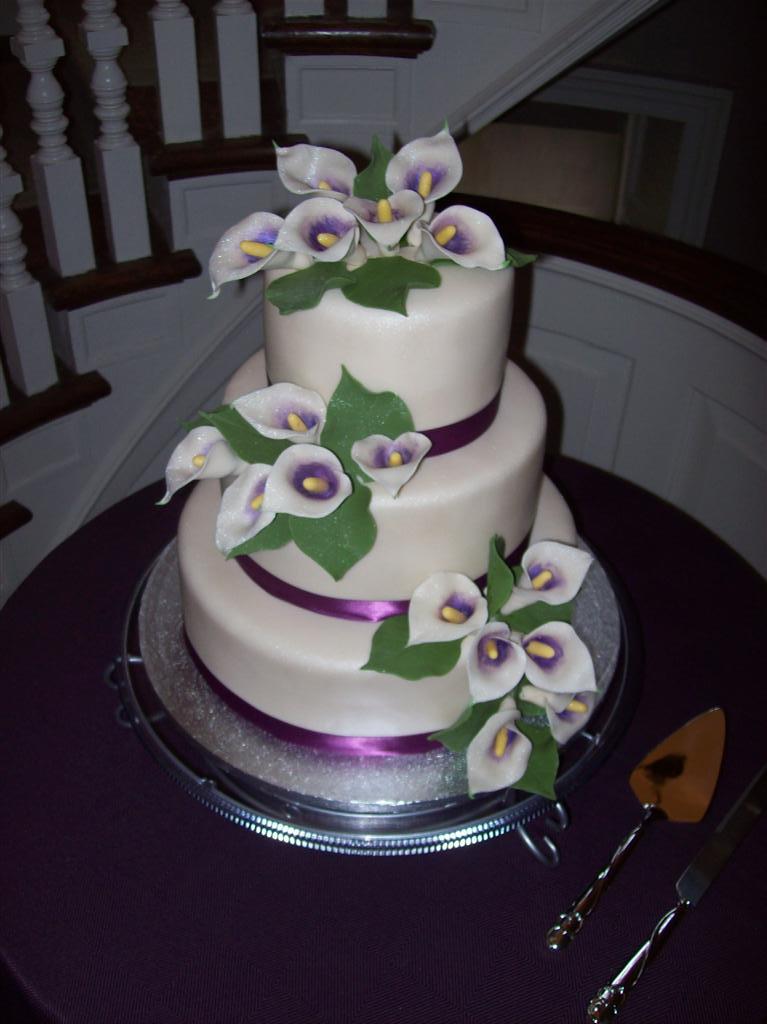 The most popular wedding cake design ever! Called "Sherryl" and serves 100 guests and decorated in white fondant with white calla lilies with yellow stamens and with a touch of purple inside to replicate the bridal bouquet's lilies.