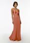Chic satin bridesmaid dress featuring a contoured bodice and v-neckline with crossing, adjustable straps that meet up with a cowl back detail. Shown in Rosewood. View swatch card for available colors.