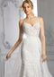 About Camie: This fit and flare, net wedding dress has a sweetheart, v-neckline and spaghetti straps.