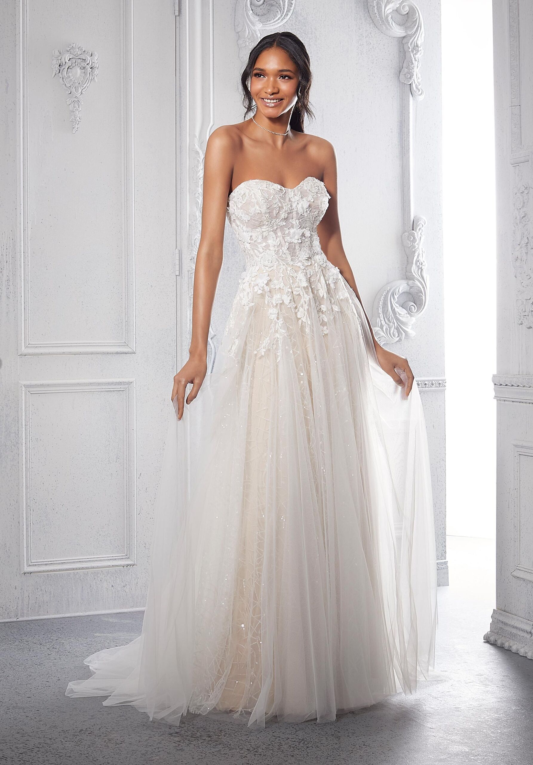 About Camellia: This net A-line wedding dress features a strapless bodice with a sweetheart neckline.