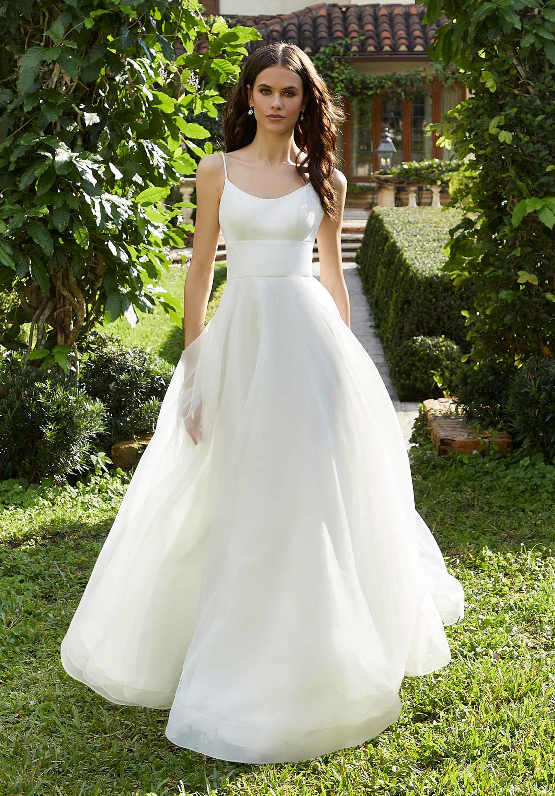 This A-line gown features a crepe bodice with scoop neckline and spaghetti straps and organza skirt.